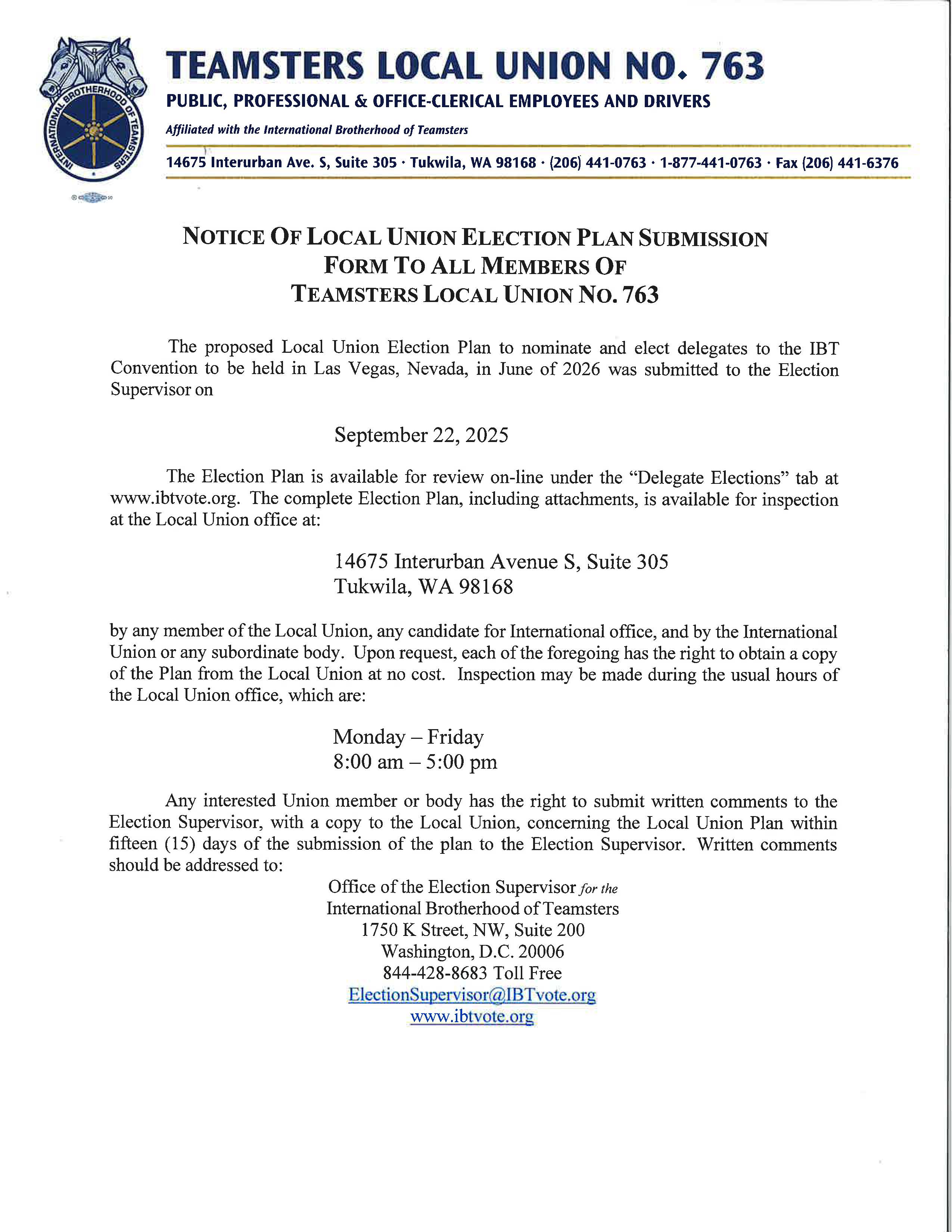 September 22, 2025 Notice of Local Union Election Plan Submission
