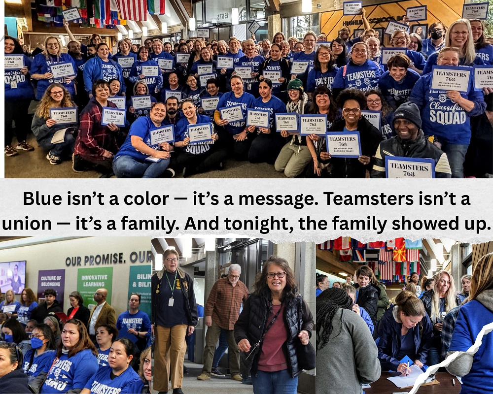 The Highline School District Board meeting became a defining moment for classified staff as 110 T3 members filled the room in Teamster blue, joined by 35 additional supporters standing proudly beside them. Together, they delivered a message that needed no microphone, no speeches, and no introductions—a message sent without a word being spoken.